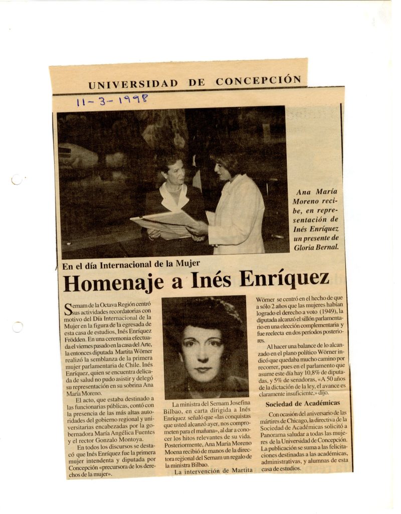 Revista Nos, Inés Enríquez Frödden, la penquista pionera en la política chilena, 28 de agosto de 2023. Revisado en revistanos.cl/ines-enriquez-frodden-la-penquista-pionera-en-la-politica-chilena/.